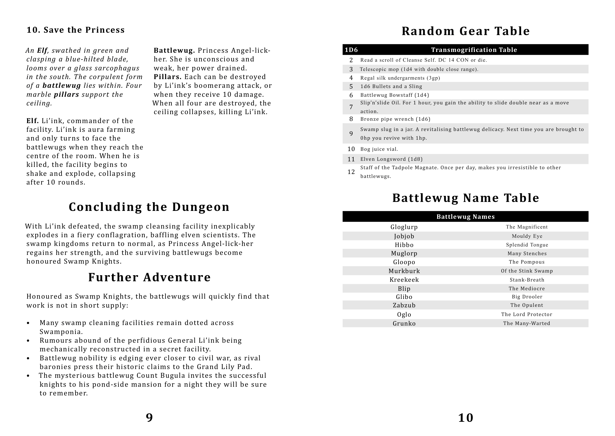 The perfidious elves have kidnapped the (sort of) beautiful princess Angel-lick-her and taken her to their swamp cleansing facility! As they drain her magic, the marsh is cleansed, making it inhospitable for all battlewugs. The swamp requires your aid, battlewugs. Will you croak, or will you fight!